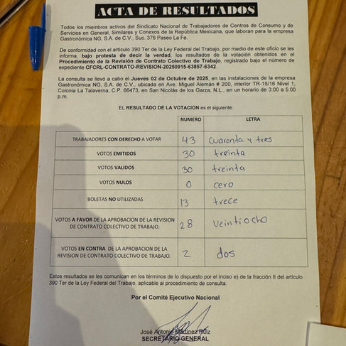 El 2 de octubre de 2025 se llevó a cabo la votación para revisión de contrato colectivo y la publicación del acta de resultados de la Sucursal 376 Noreste Grill Paseo La Fe.